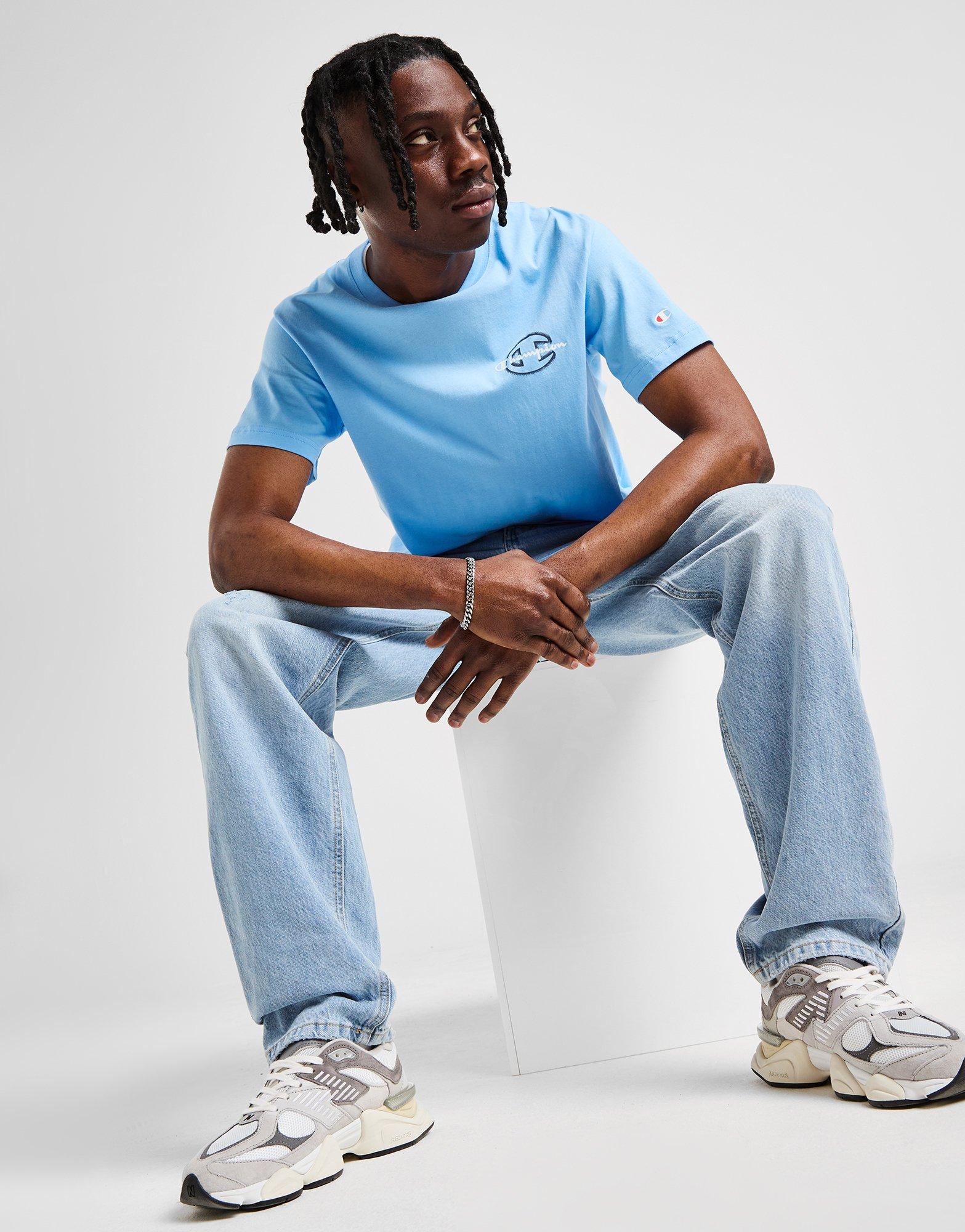 Blijf fris als de zon schijnt met dit Small Logo T-shirt voor heren van Champion. In het blauw is dit lichtgewicht topje gemaakt van zachte katoenen stof voor een koele en comfortabele dracht. Het heeft een geribbelde ronde halslijn en korte mouwen met licht verlaagde schouders. Afgewerkt met Champion-scriptbranding op de borst en een geborduurd logo op de linkermouw. Machinewasbaar. | Ons model is 6'0" met een borstomvang van 35" en draagt maat M.