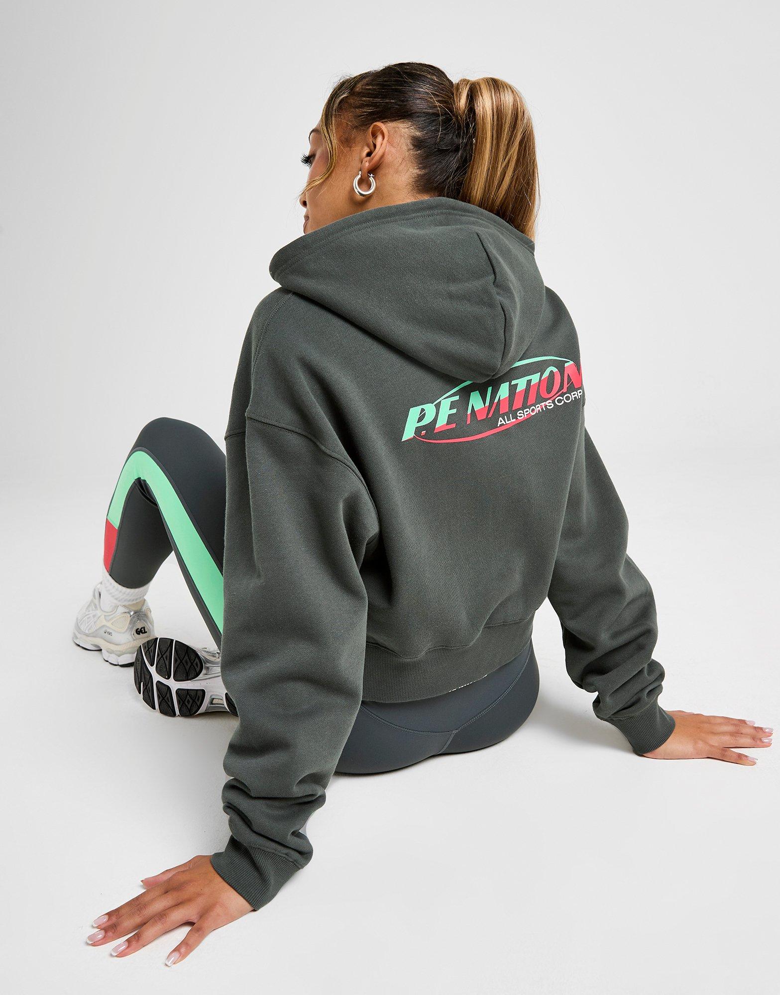 Til je relaxte looks naar een hoger niveau met deze Impact Full Zip Hoodie voor dames van PE Nation. Deze exclusieve JD-hoodie in de kleur Dark Shadow is gemaakt van een superzachte fleecemix met veel katoen voor ultiem comfort. Hij valt oversized voor een relaxte sfeer en heeft een rits over de volledige lengte met een vaste capuchon voor comfortabele bedekking. Hij heeft elastische geribbelde boorden voor een strakke en veilige pasvorm en een gespleten kangoeroezak aan de voorkant. Afgebeeld met opvallende PE Nation-branding. Machinewasbaar. | Ons model is 1,73 m lang en draagt maat M.