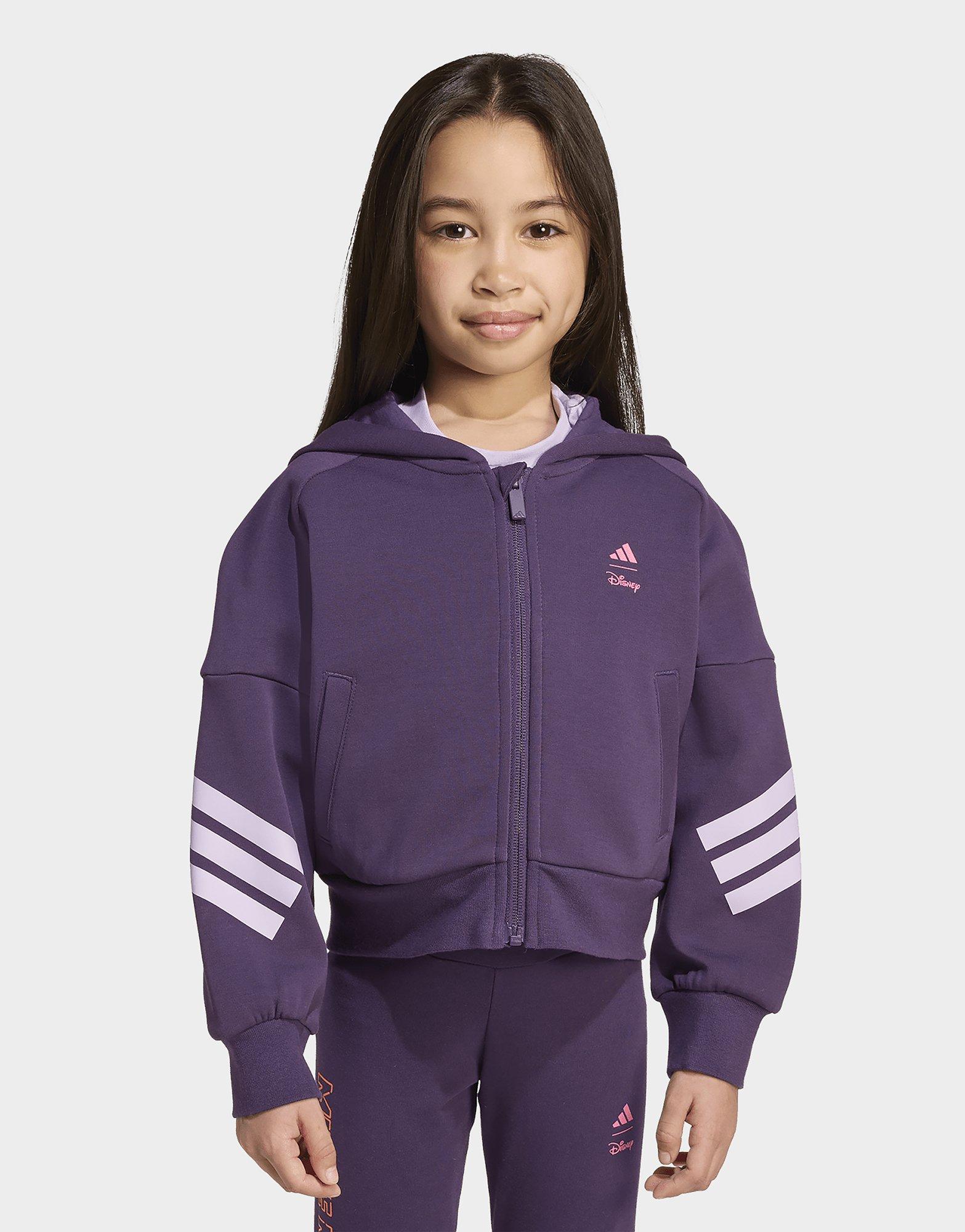 Kinderen zullen dol zijn op de magie van dit adidas Disney trainingsjack. Het is gemaakt van zacht, behaaglijk materiaal met een ruime capuchon en een rits aan de voorkant, en heeft een sportief, meisjesachtig silhouet met een grote, leuke Disney-graphic op de achterkant en adidas 3-Stripes die over de onderkant van de mouwen lopen.