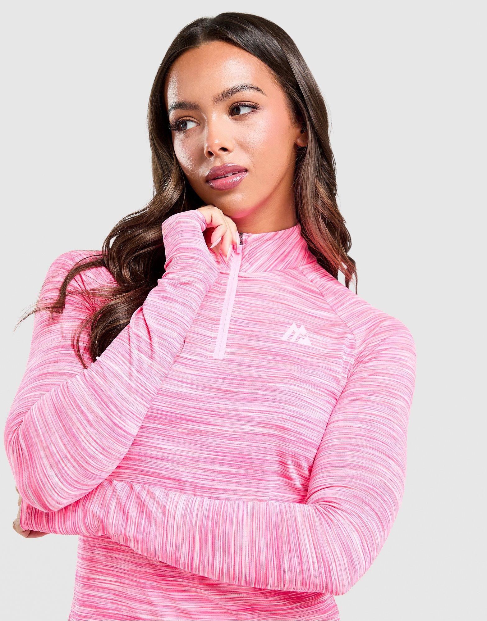 Ritssluiting dicht. Stap naar buiten. Deze Trail 1/4 Zip Top voor dames van MONTIREX is perfect voor alles, van boodschappen doen tot sporten. De top is gemaakt van elastische roze stof en heeft een kwartrits, lange mouwen en duimlussen aan de manchetten. Afgewerkt met het klassieke Montirex-logo op de borst. Machinewasbaar | Ons model is 1,70 m lang en draagt maat S.