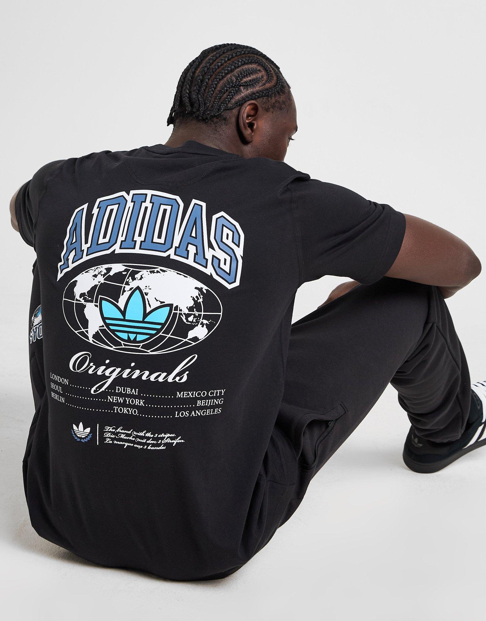 Exclusief bij JD. Wanneer de straat jouw podium is, val je op in dit Worldwide T-shirt voor heren van adidas Originals. In een zwarte kleurstelling heeft dit iets ruimere topje een gestructureerde en zachte katoenen constructie voor dagelijks comfort. Het heeft een geribbelde ronde halslijn en is afgewerkt met adidas Trefoil world tour branding op de borst en rug. Machinewasbaar. | Ons model is 6'1" met een borstomvang van 39" en draagt maat M. | KA7455