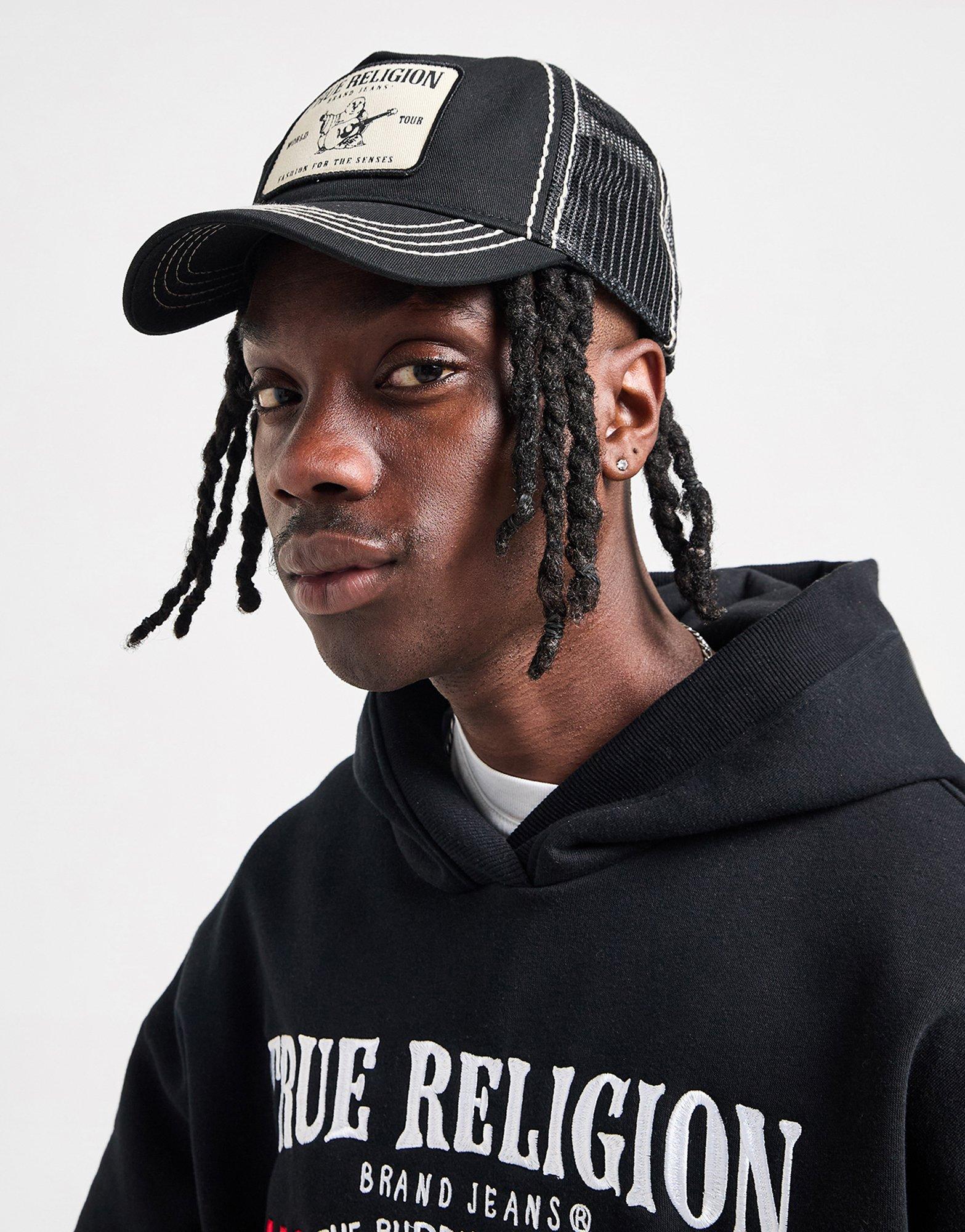 Verfris je 'fit' met deze Big T Trucker Cap van True Religion. Deze pet in een zwarte kleurstelling is gemaakt van zacht, duurzaam katoen voor totaal comfort. Hij heeft een gebogen rand om de bedekking te vergroten, een snapback-sluiting om de pasvorm aan te passen en mesh-achterpanelen om het koel te houden. Afgewerkt met contrasterende Big T-topstitching en een Buddha-logopatch op de voorkant. Handwas.