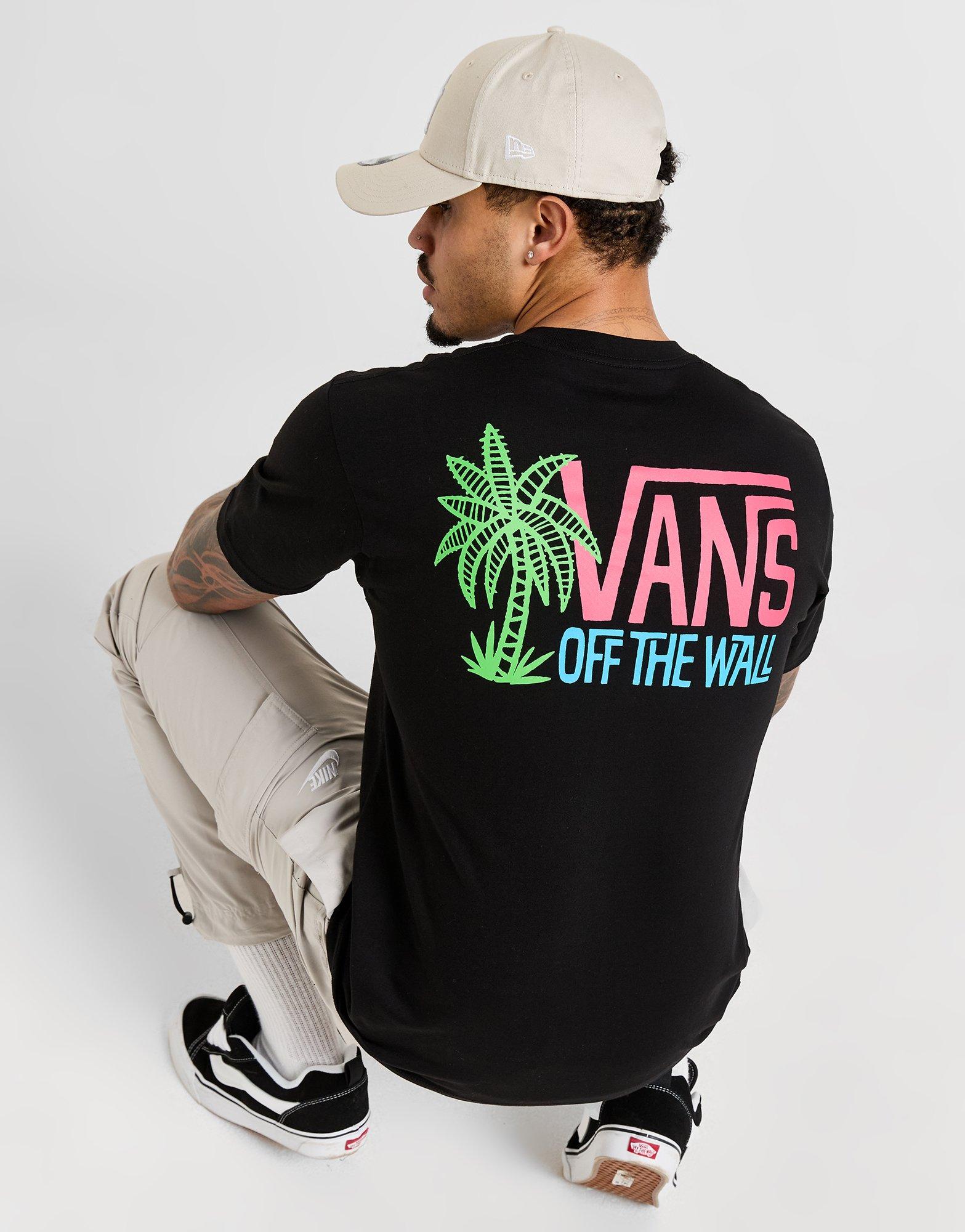 Fris je dagelijkse basics op met dit Off The Wall Palm T-shirt voor heren van Vans. Dit zwarte regular-fit T-shirt is gemaakt van zacht, lichtgewicht katoen voor langdurig comfort. Het heeft een geribde ronde halslijn en korte mouwen voor een gemakkelijk gevoel, en is afgewerkt met een opvallende Vans Off The Wall-palmboomafbeelding op de achterkant. Afgetekend met een verkleind logo op de borst. Machinewasbaar. | Ons model is 1,80 meter lang, heeft een borstomvang van 36,5 inch en draagt maat medium.